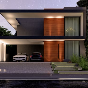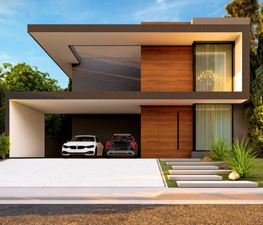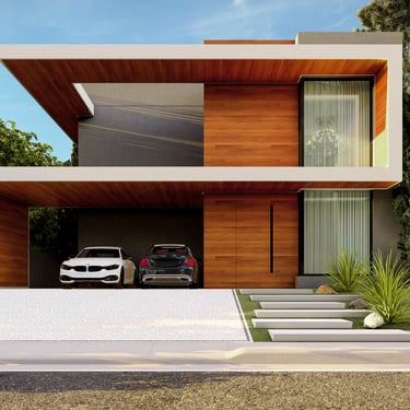 O projeto contempla duas opções de fachada, permitindo que a arquitetura se adapte ao perfil e às preferências do cliente sem perder sua essência técnica. A primeira versão utiliza acabamento amadeirado, trazendo aconchego, sofisticação e contraste com os planos neutros, além de reforçar a conexão com materiais naturais. A segunda opção adota pintura projetada, conferindo uma leitura mais contemporânea, uniforme e de baixa manutenção, ideal para quem busca praticidade aliada a um visual marcante.