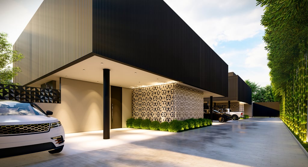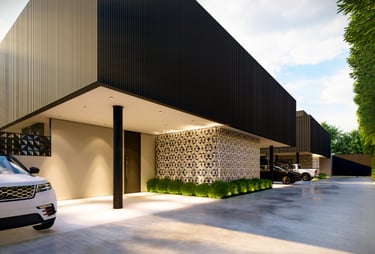 As casas apresentam linguagem moderna, com volumetrias bem definidas, proporções equilibradas e soluções arquitetônicas que conferem unidade ao conjunto, ao mesmo tempo em que preservam a individualidade de cada residência. Essa abordagem garante coerência visual e valor agregado ao empreendimento como um todo.