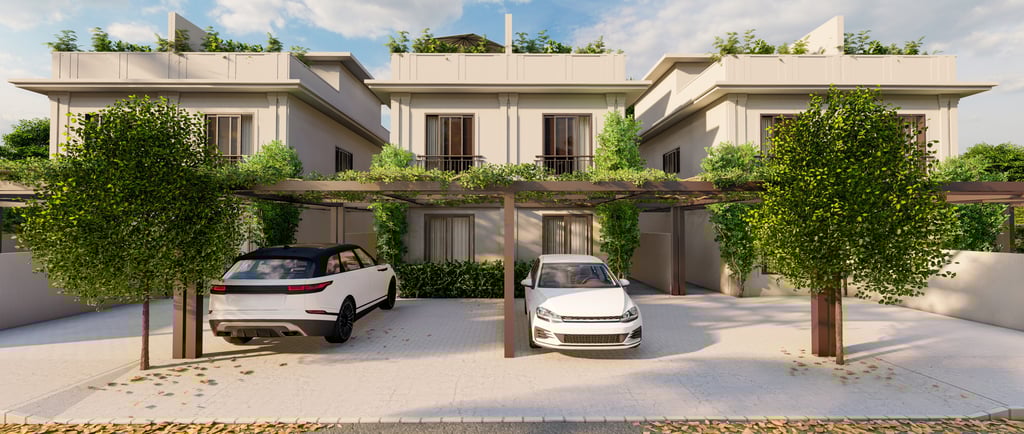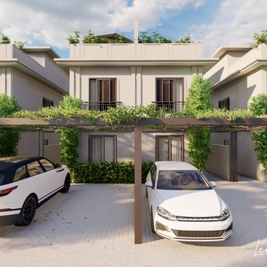 A volumetria foi cuidadosamente estudada para conferir ritmo e unidade ao conjunto, utilizando simetria, marcações verticais e horizontais bem definidas e jogos de cheios e vazios que reforçam a elegância das fachadas. Mesmo sendo casas geminadas, o tratamento volumétrico garante uma leitura sofisticada e harmônica, evitando monotonia visual e elevando a percepção de exclusividade.